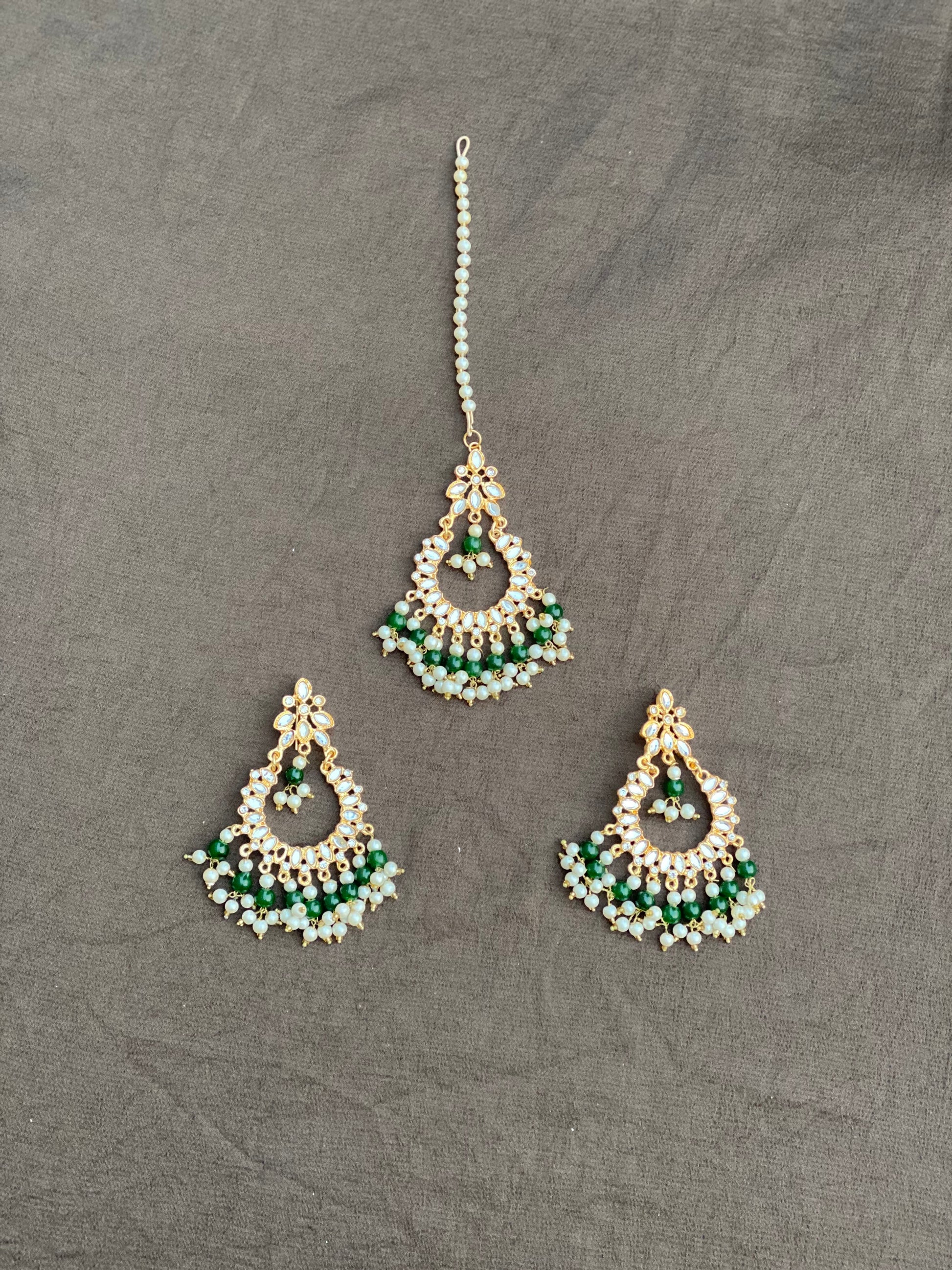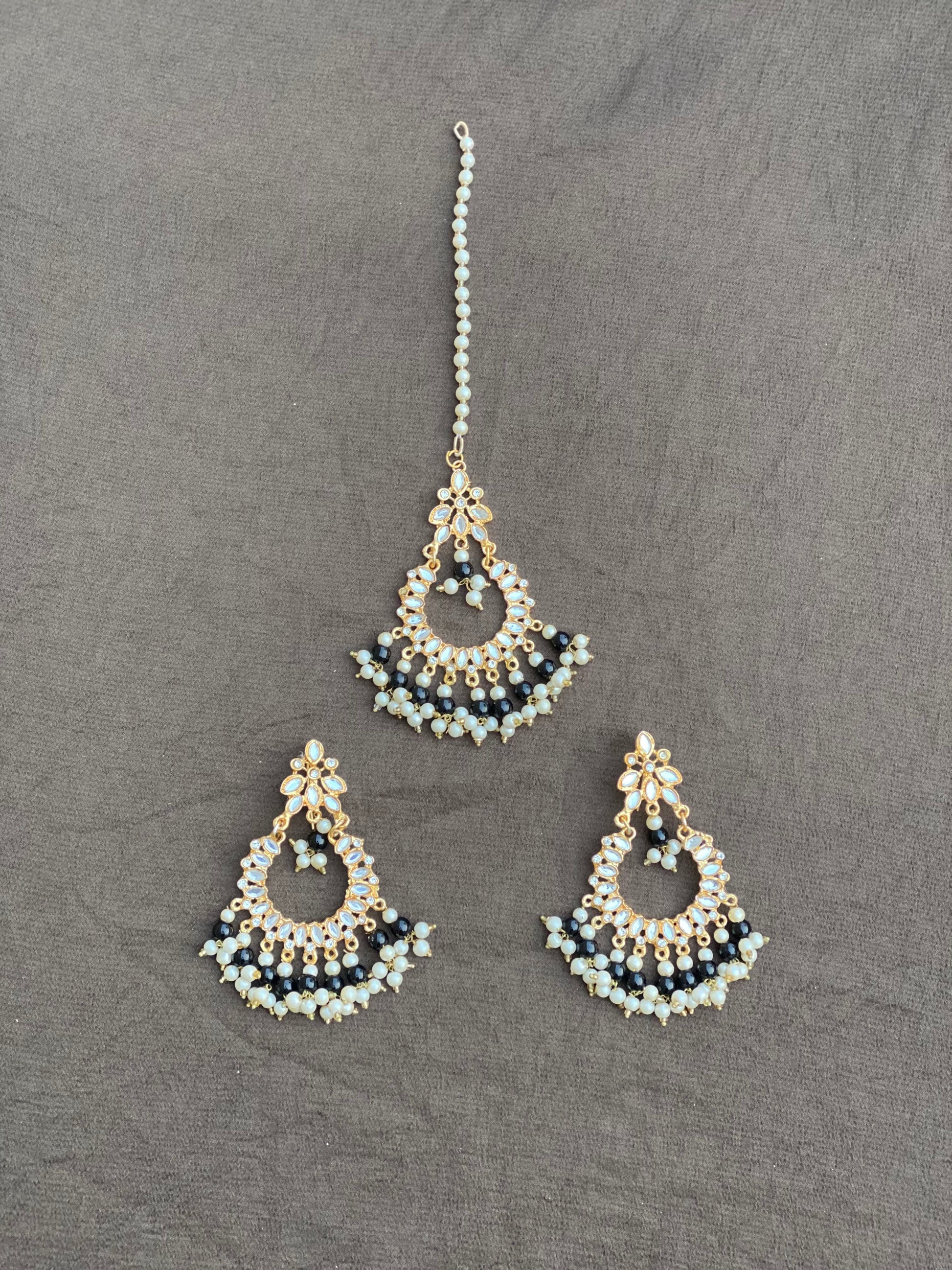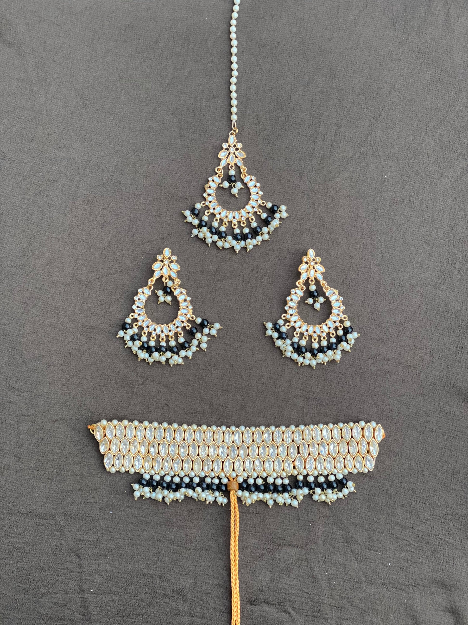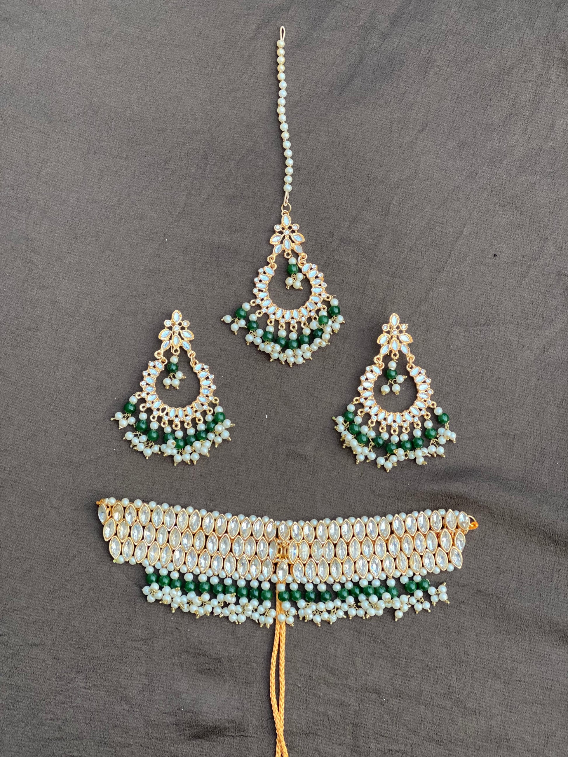 Get ready to shine with sophistiquee's 4 piece choker set. Nothing will catch the eye quite like this stunning set of earrings and necklace and bindi, available in both black and green. The kundan choker is perfect for adding a bit of ethnic flair to your festive look. Step out in style and let your accessories do the talking this season with sophistiquee's 4 piece choker set.