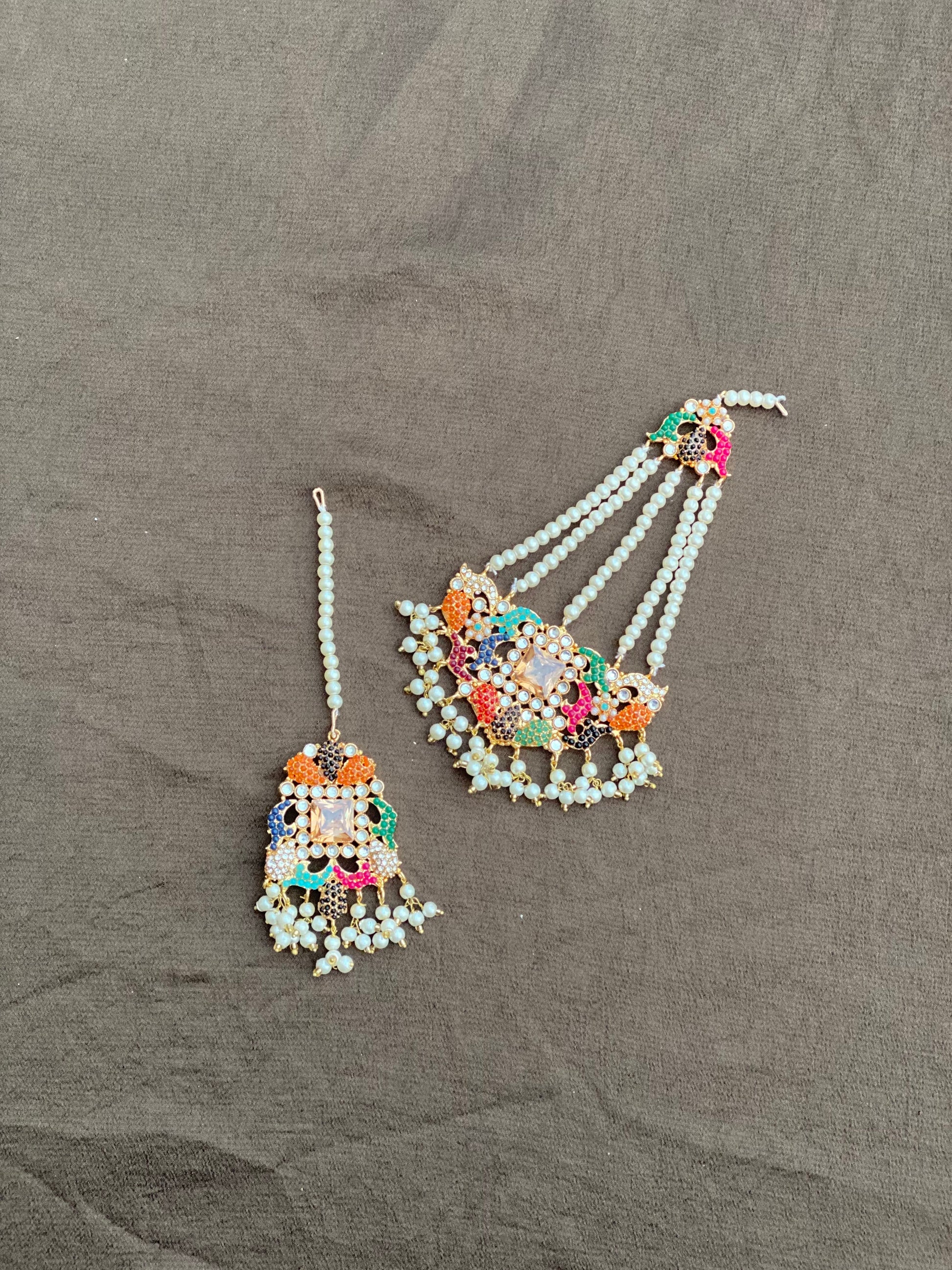 Step up your traditional style game with the Nauratan 5 Piece Choker Set. This Indian-inspired set features a necklace and bindi, perfect for adding ethnic flair to any festive ensemble. Crafted with a multicolored design, this set also includes an earring and a jhoomar. Whether you're dressing up for a family event or simply want to accessorize your favorite traditional look, this 5 piece choker set is the perfect way to bring out your sophisticated style.