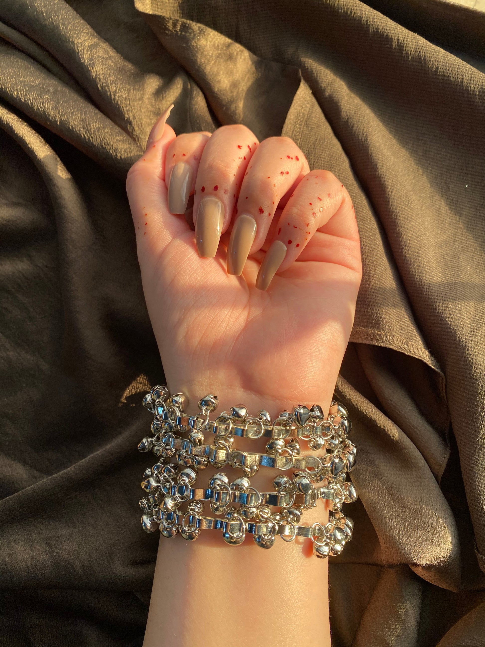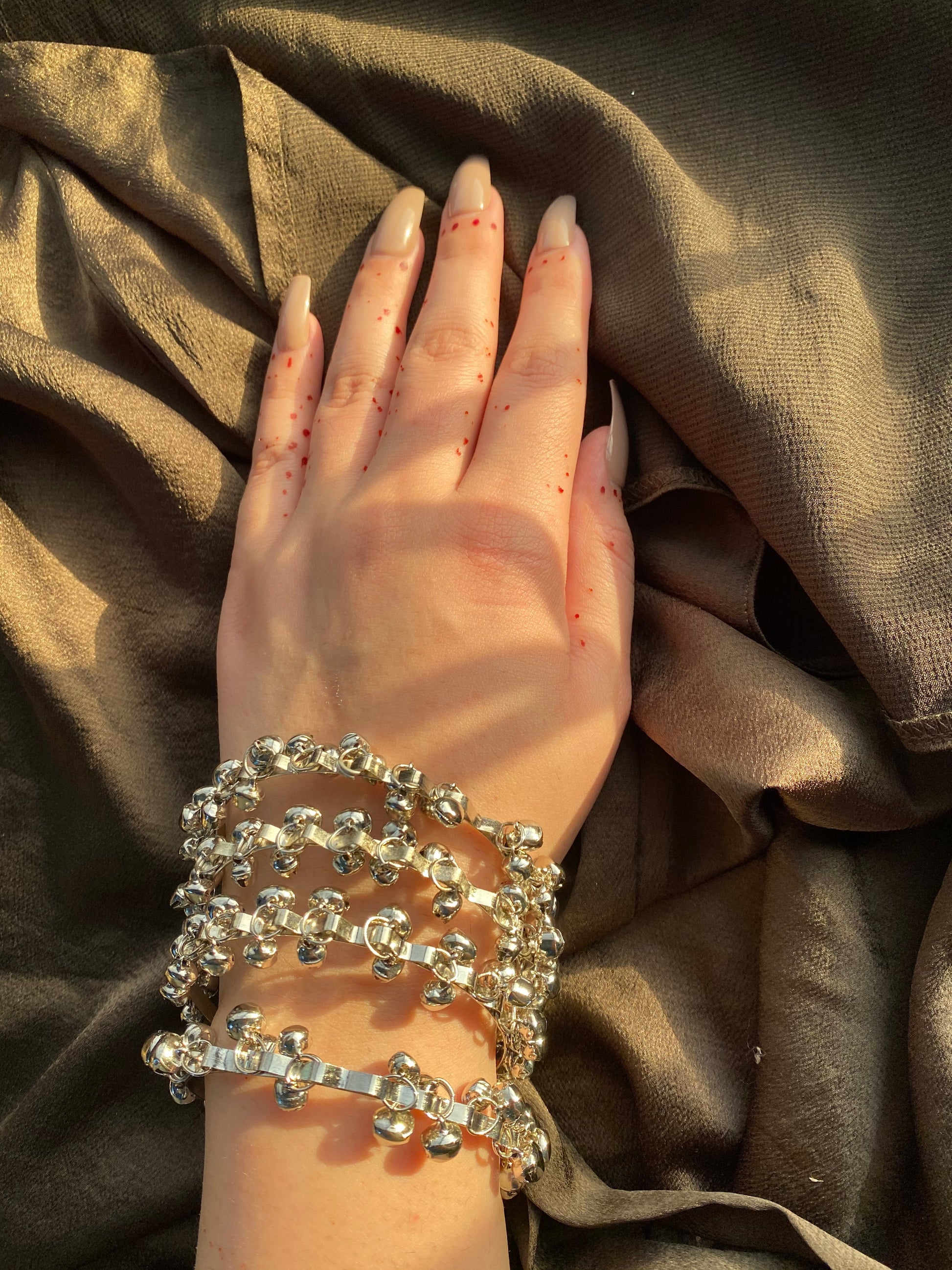 Add a jingle to your jangle with these gleaming ghungroo bangles. This four-piece set of casual yet festive bangles is ideal for adding an ear-catching “ka-ching” to your everyday ensemble or glamming up your Eid attire. Crafted from shiny metallic with dangling ghungroo bells, these bangles sing with your every gesture, announcing your arrival and lifting your mood with their joyful jubilation. Wear them stacked together for an arm party that doesn’t stop, or separate them to spread the cheer. Wherever your day takes you, these bangles bring a fun, festive soundtrack to your style. Slip them on and prepare to make spirits bright with every flick of the wrist! After all, happiness is in the little details—and few details deliver delight quite like the musical ring of these gleeful ghungroo bangles.