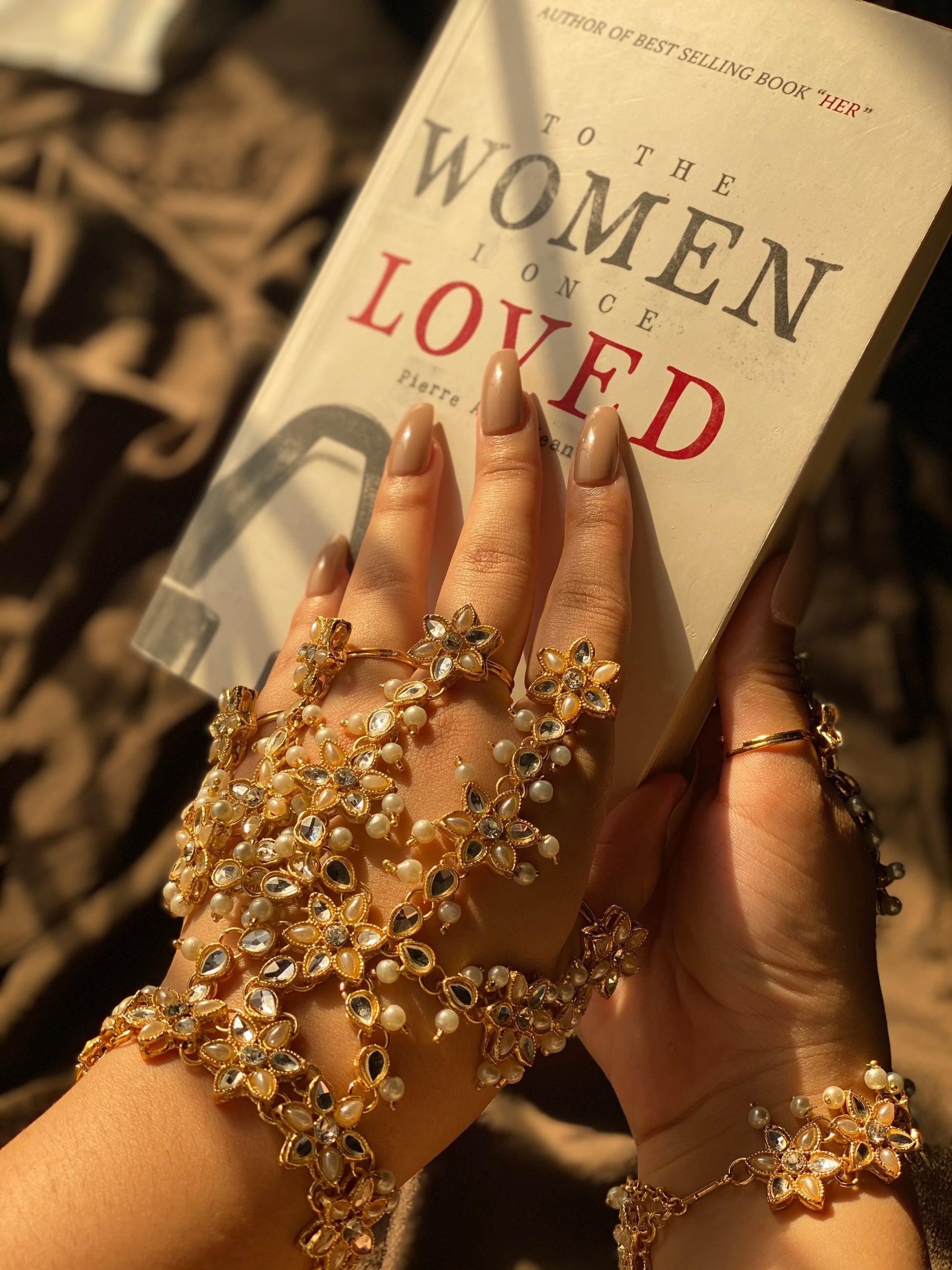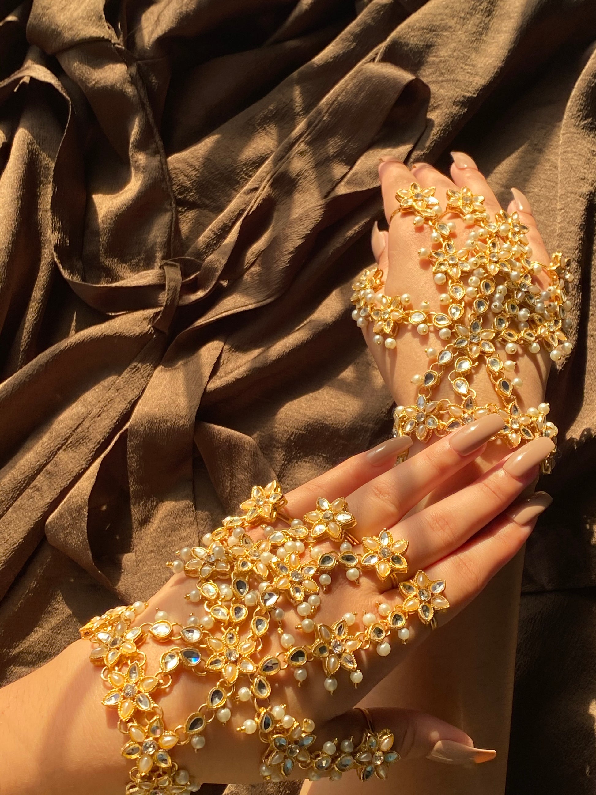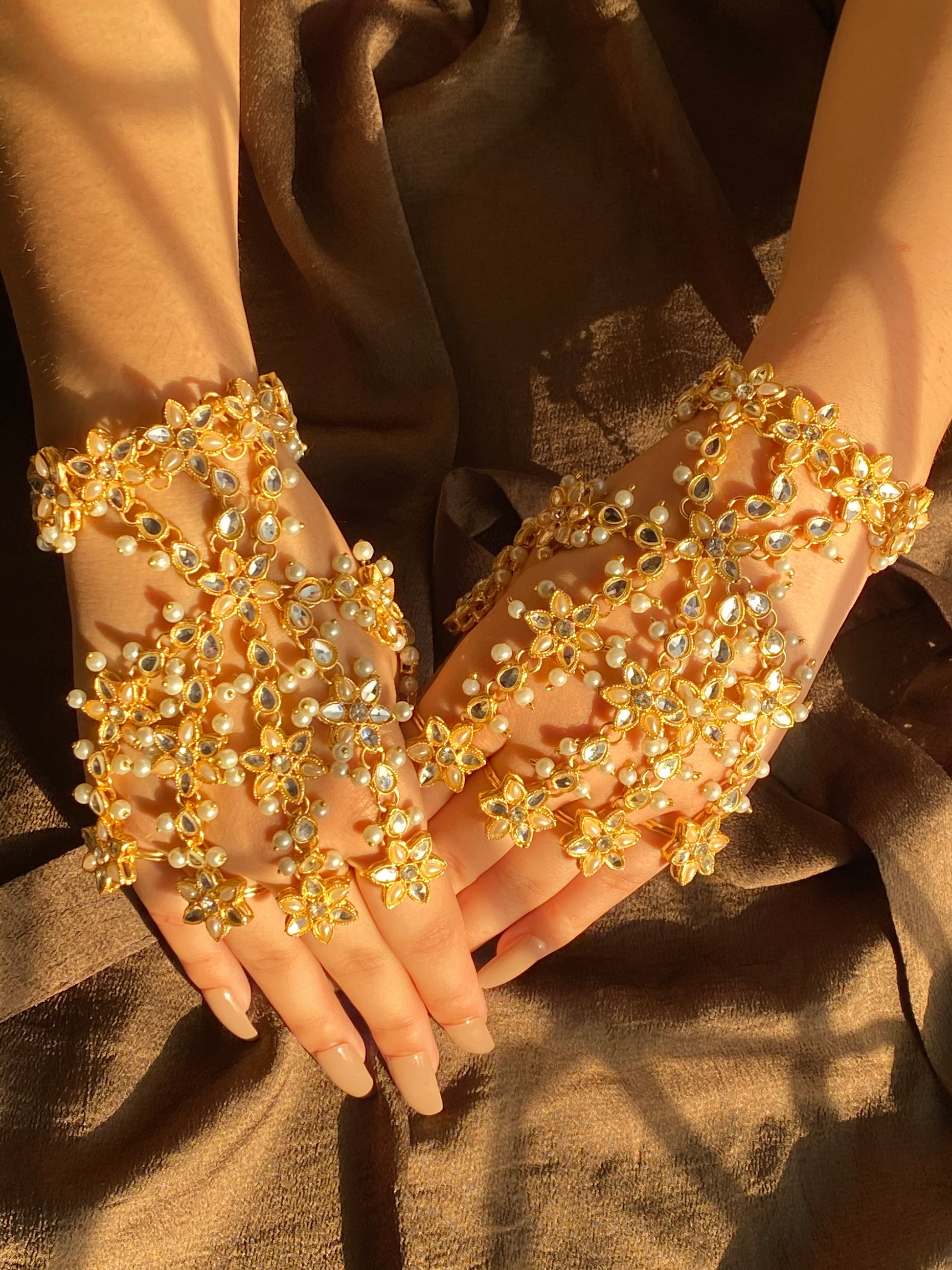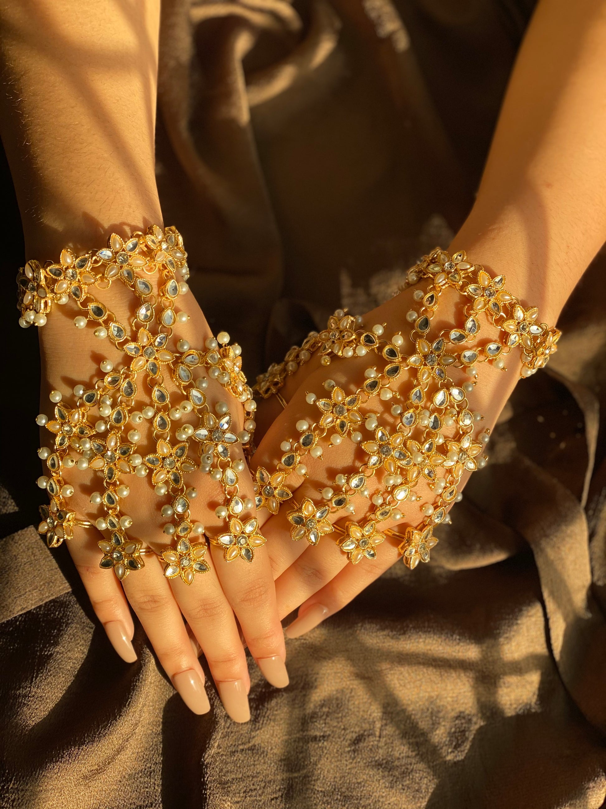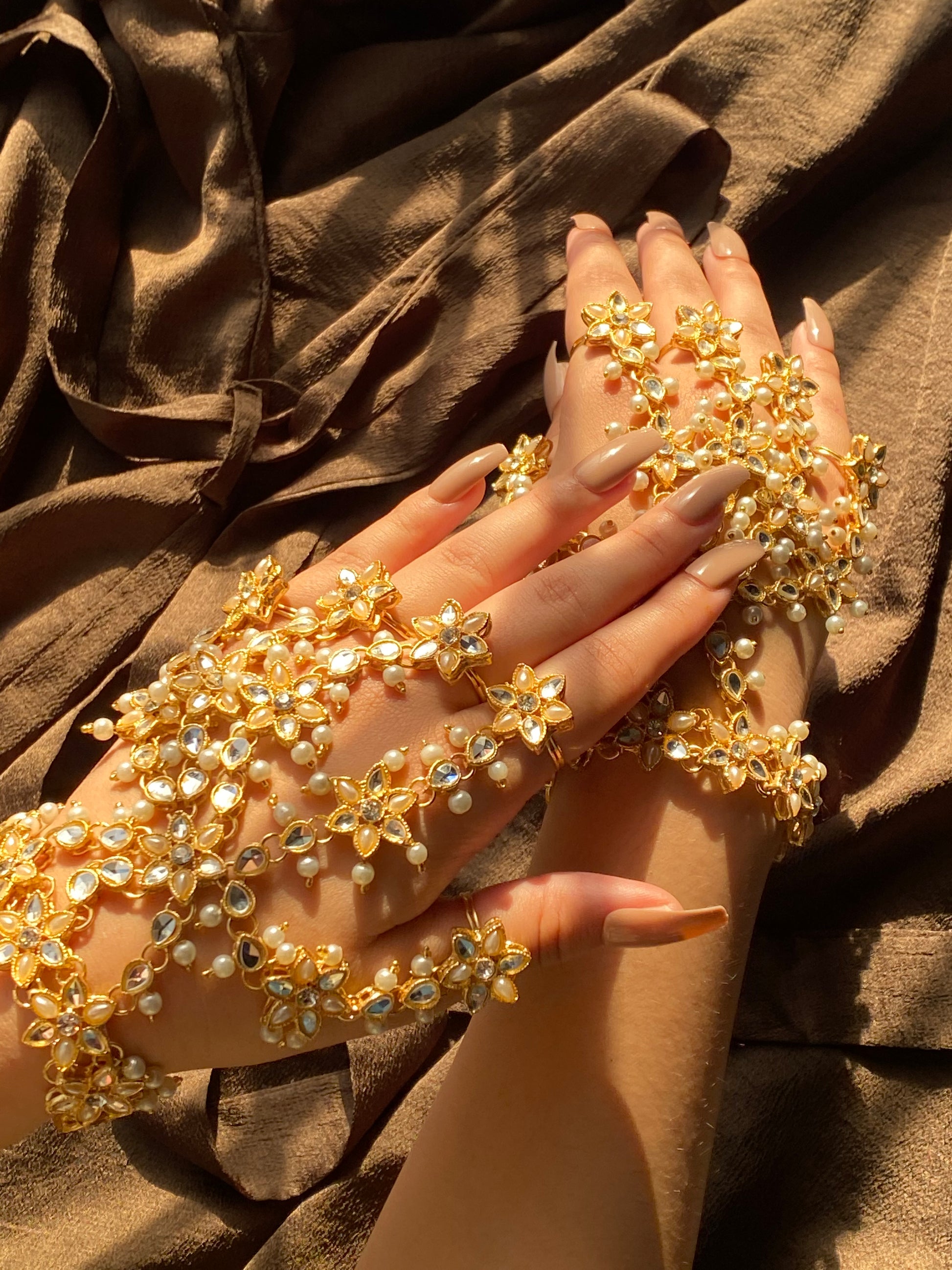 This golden hand harness transforms your hands into a work of art. Crafted from an ornate filigree design, this hand harness brings glamor and sophistication to any special occasion. Its intricate details catch the light for a dazzling display that evokes old bollywood grandeur and Gatsby-esque decadence. Whether you’re dressing up for a wedding or gala ,this hand harness provides a trendy statement piece that gives new meaning to ‘gilded glamor’. You’ll feel like a golden screen siren ready to make a dramatic entrance. After all, when it comes to festive fashion, more is always more. And this hand harness is haute couture at its finest.