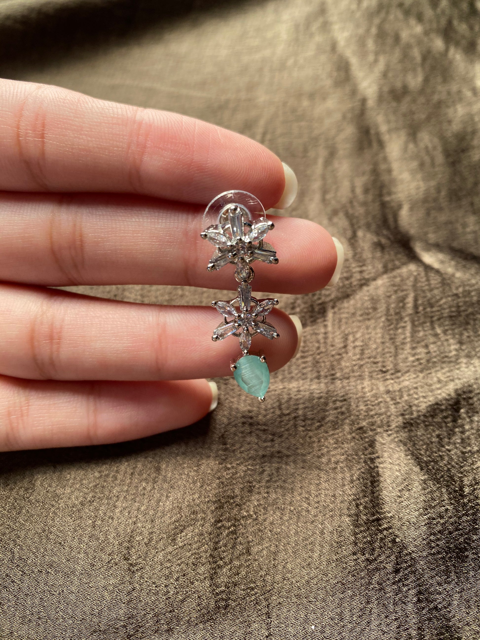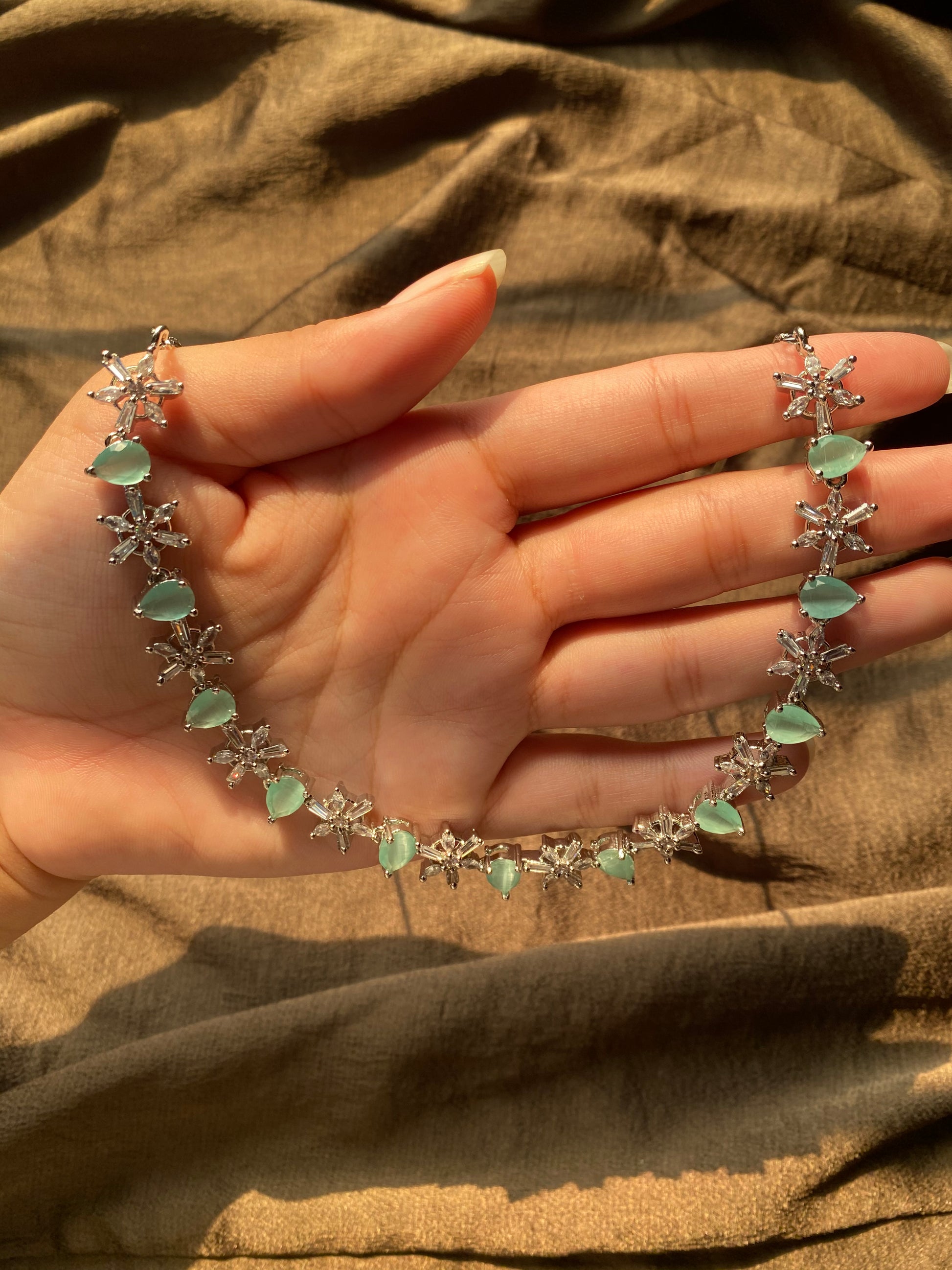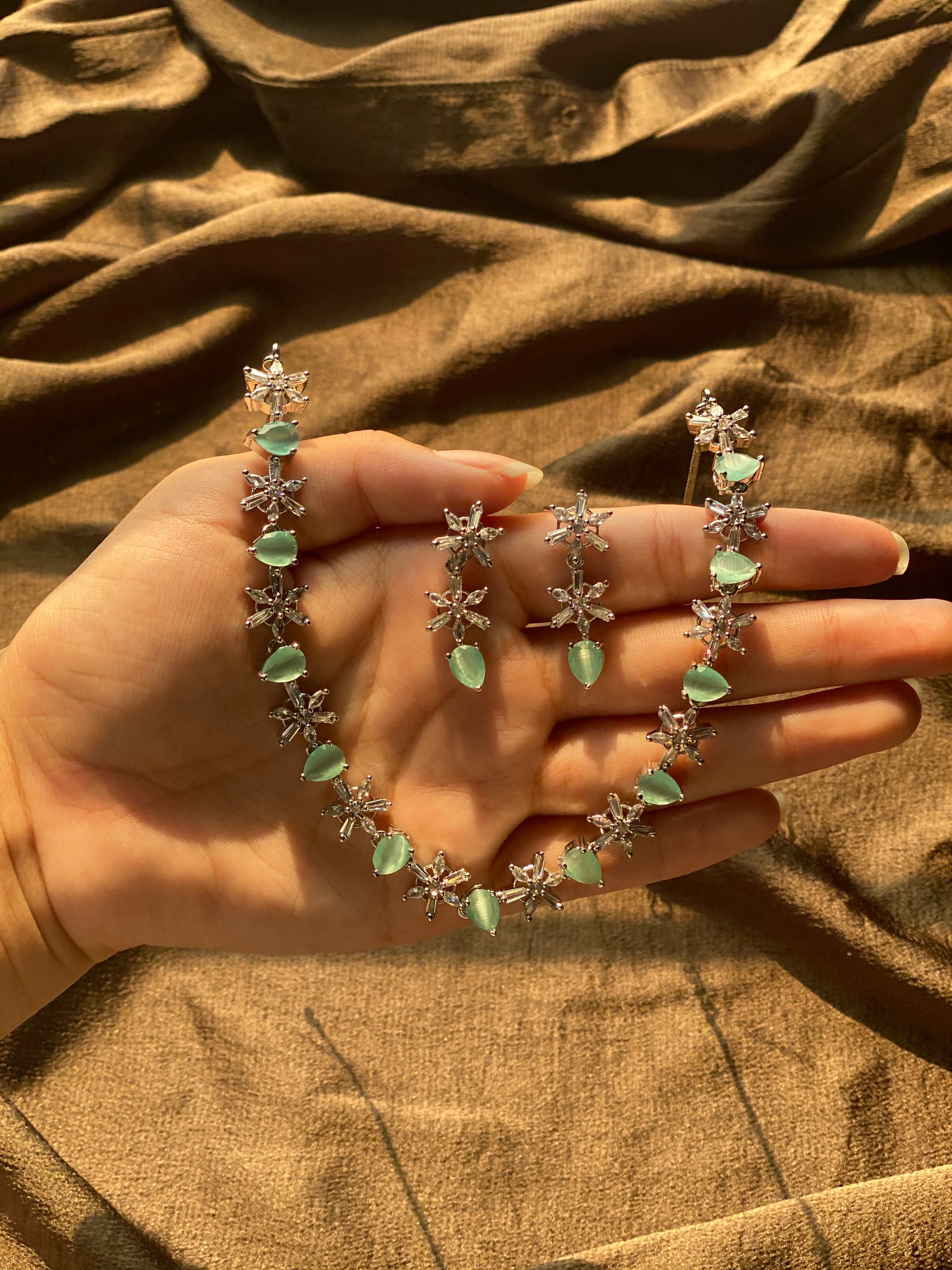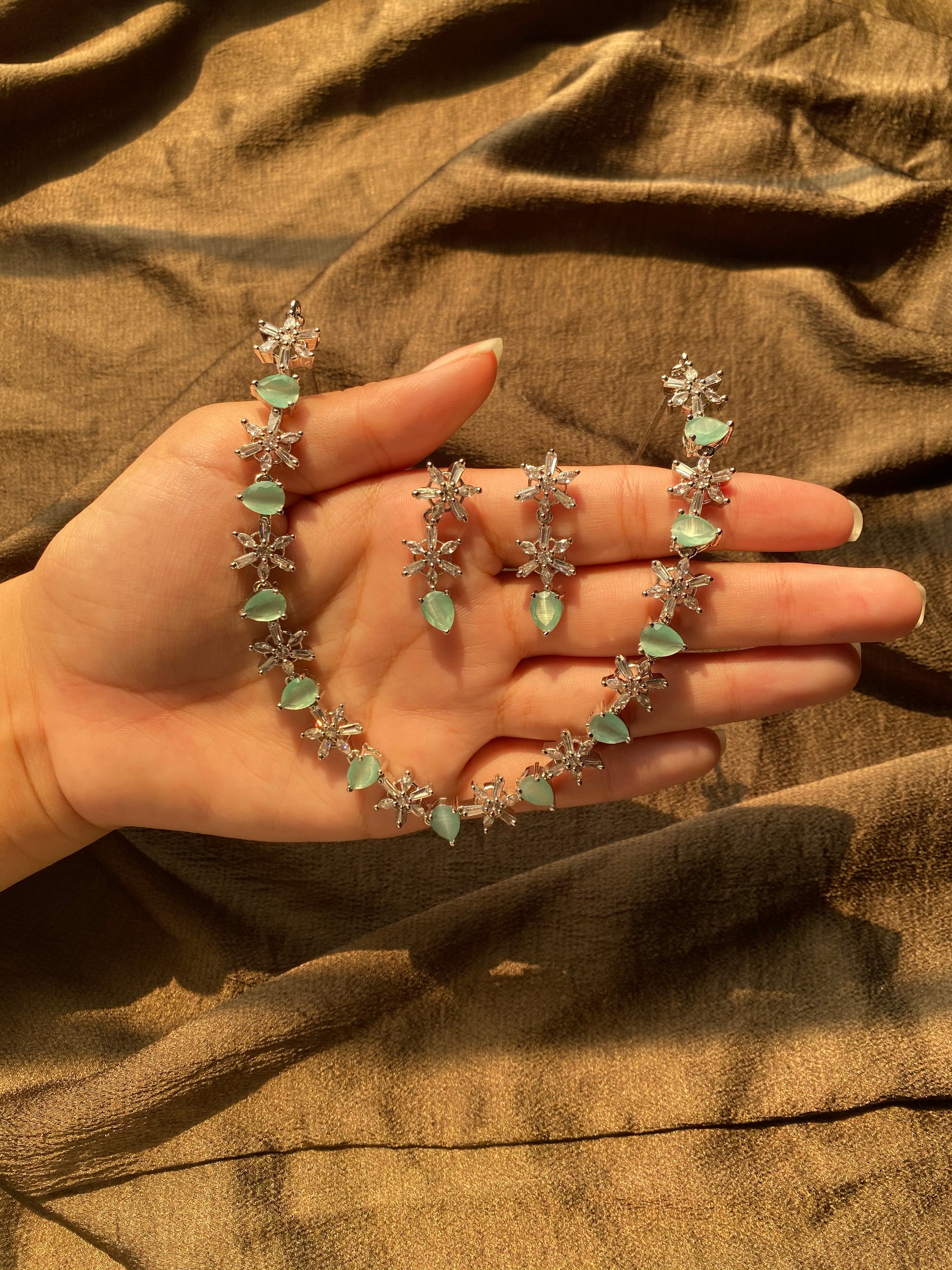 Be the center of attention with this Sophistiquee mint green rhodium plated set. This elegant statement piece features a sophisticated design, adorning you with a stylish sparkle. Crafted with high-quality 1 karat stones, this gorgeous two-piece set includes earrings and a necklace. Dress up any outfit and bring a touch of class to your look with this exquisite set. Get ready to shine!