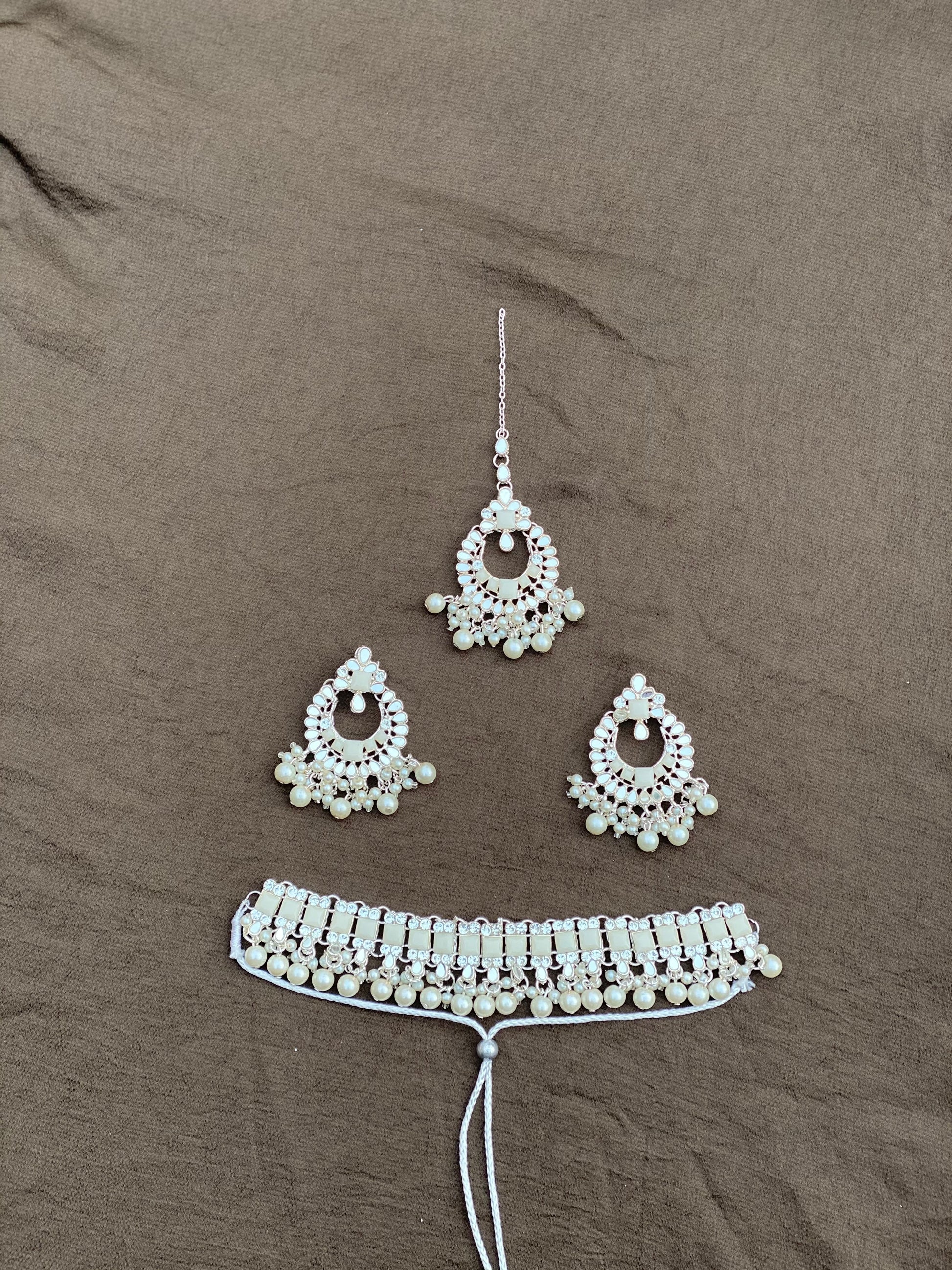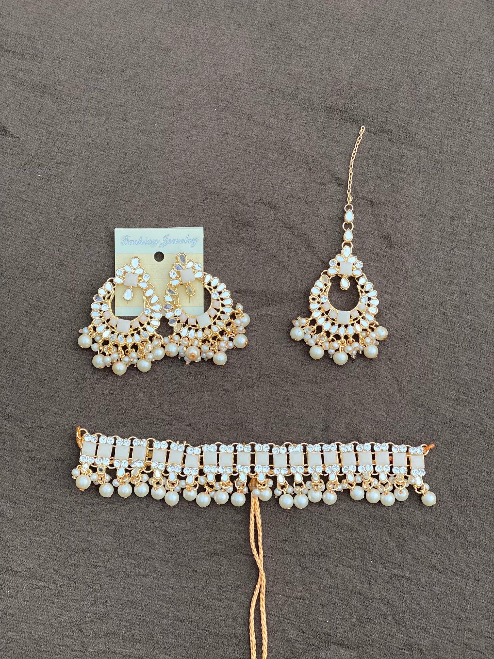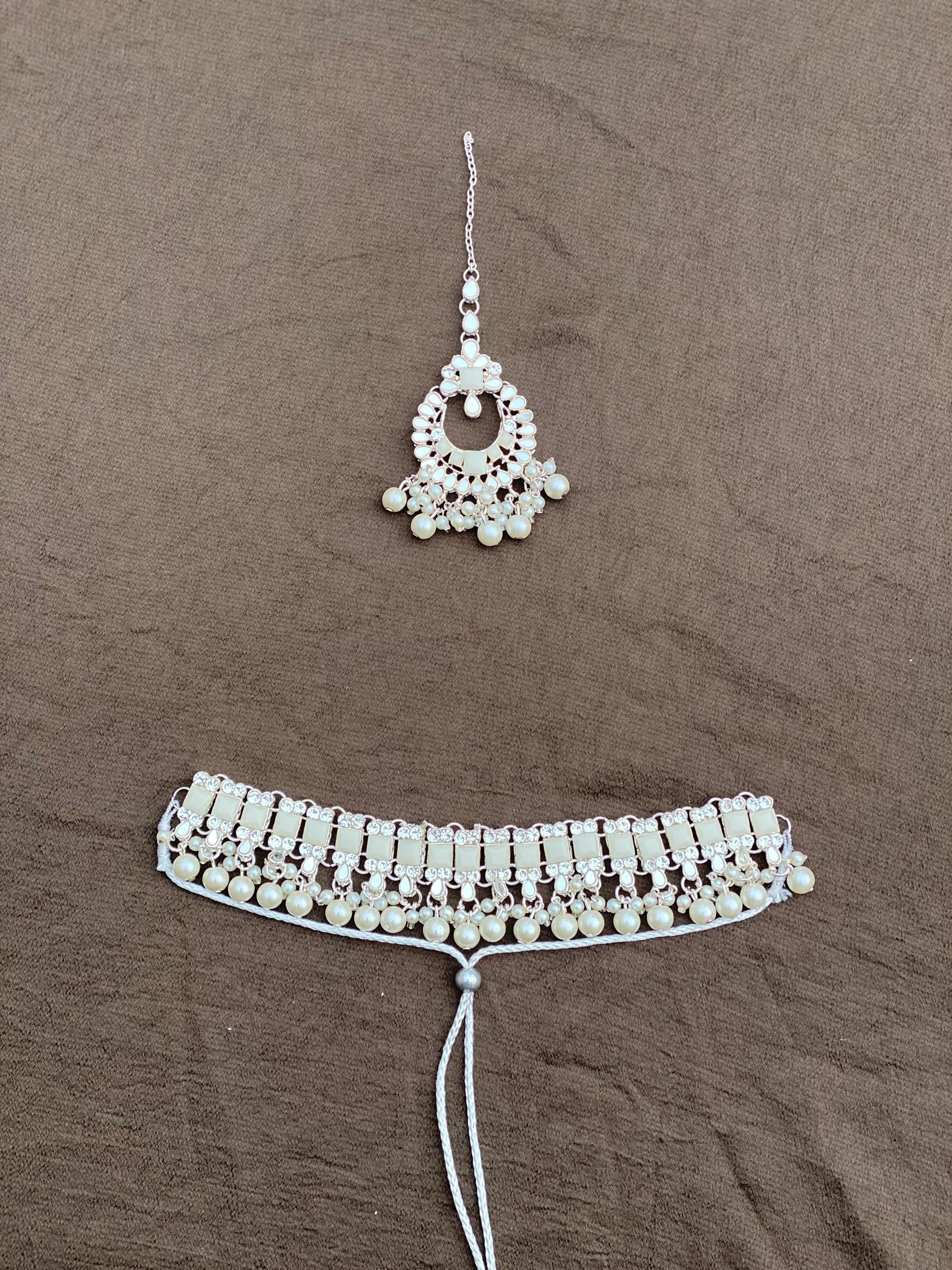 Be the belle of the ball with this Pearled Choker Set. Get all dressed up for special events or festive occasions with this set which includes a choker, earrings, and bindi-style necklace. Sophisticated and chic, this pearl-encrusted set will bring any outfit to life. Available in pink white and beige, bring a bit of glamor to your wardrobe with this timeless set. Elevate any look with this set for a truly stunning statement piece.