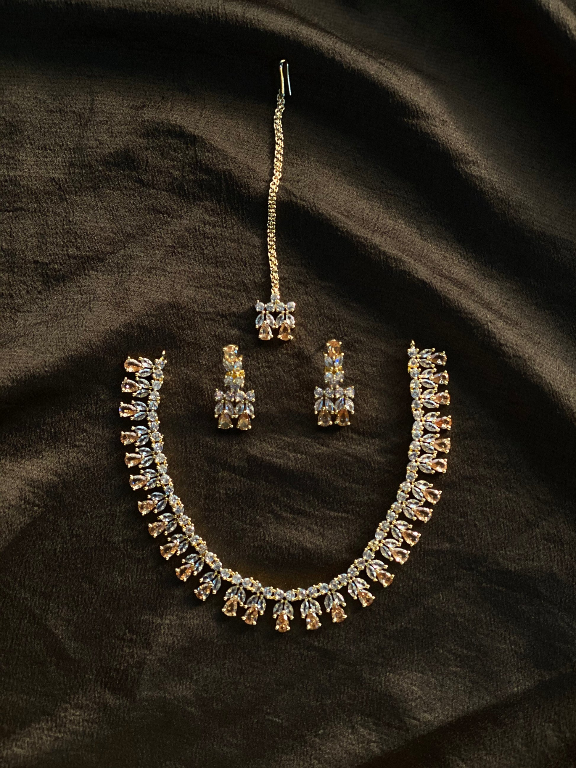 Give your look a timeless elegance with this rose gold necklace set from sophistiquee. Featuring a 1-karat necklace and earrings, plus a bindi, it’s the ideal accessory for any sophisticated and elegant outfit. Whether you’re attending an evening soiree or just adding some special touches to your everyday look, this set is sure to turn heads.
